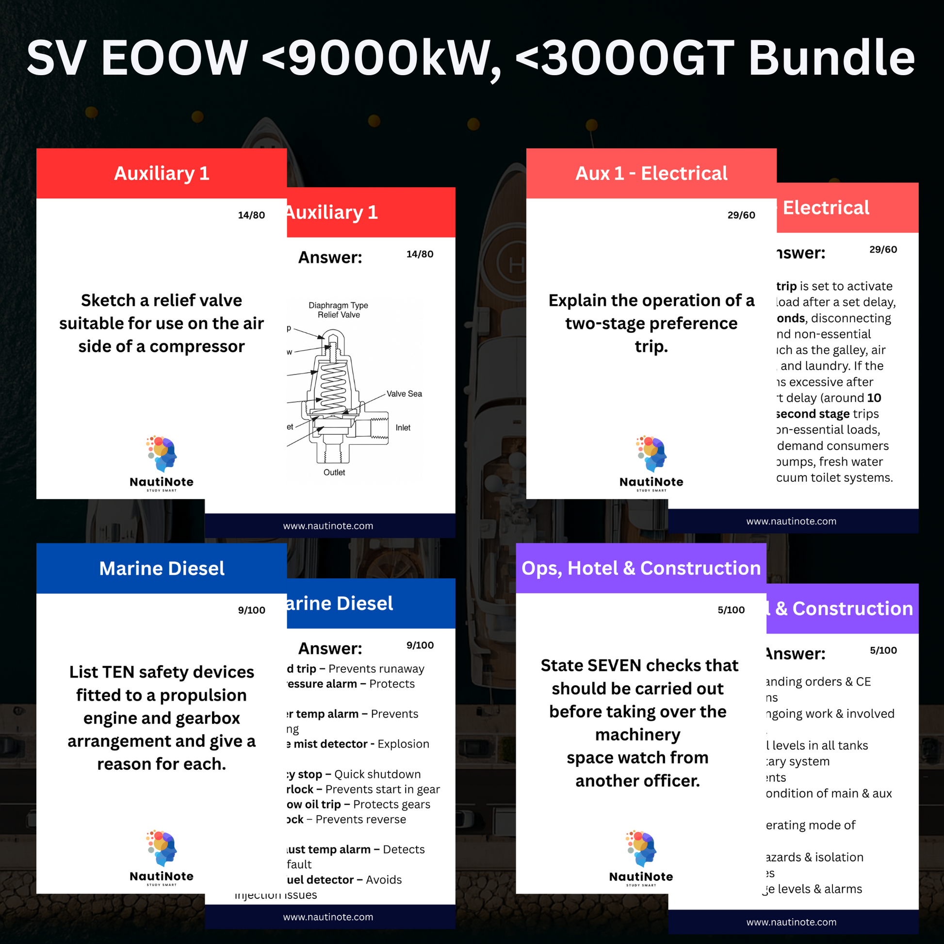 Prepare confidently for your Small Vessel Engineer Officer of the Watch (<9000kW, <3000GT) exams with this comprehensive bundle of four flashcard packs, tailored to the syllabus and designed for active recall and exam success.