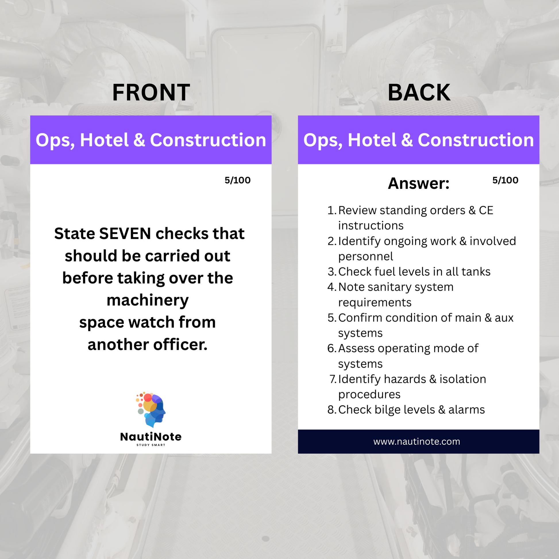A focused set of 100 flashcards designed specifically for students preparing for the Small Vessel Engineer Officer of the Watch (SV EOOW <9000kW, <3000GT) certificate. These pocket-sized cards break down essential operational routines, onboard systems, and ship construction concepts into exam-style prompts — ideal for studying on the go, from the engine room to the airport.